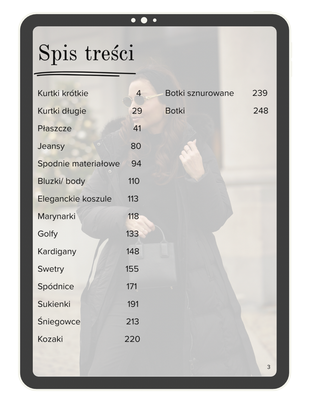Styl w eBooku jest klasyczny i kobiecy, ale nie tylko „sztywny”. Znajdziesz tu też codzienne, wygodne zestawy, które nadal wyglądają elegancko.